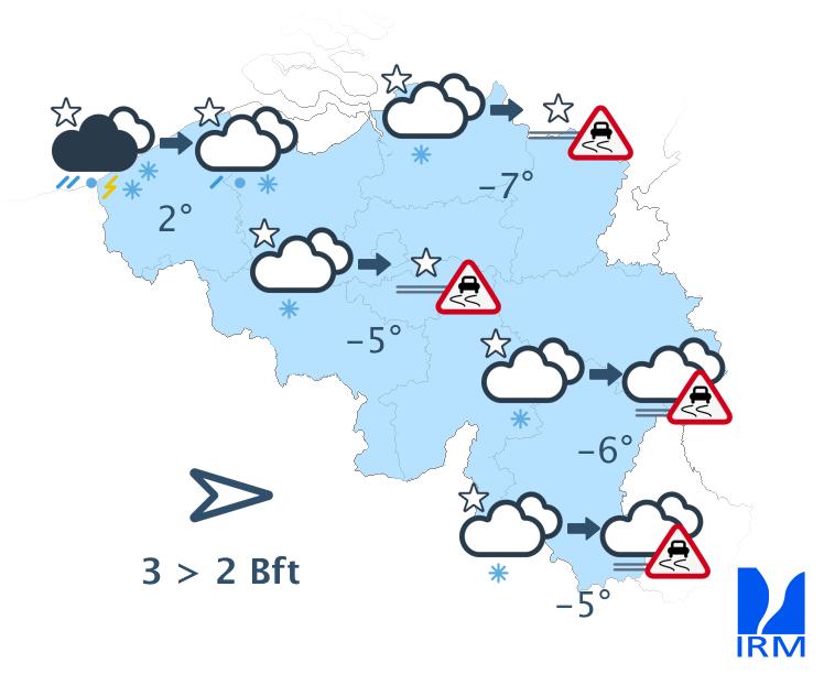 Durant la nuit de lundi à mardi, la nébulosité deviendra d'abord variable à abondante avec un risque d'averses de neige, voire même de grésil à la côte avec là aussi possibilité d'un coup de tonnerre. On notera aussi un risque de formation de bancs de brouillard givrant. Les minima s'échelonneront de -12 degrés sur les hauteurs de l'Ardenne à +1 ou +2 degrés en bord de mer. Les conditions deviendront donc à nouveau glissantes par endroits. Le vent sera faible à modéré de secteur ouest à nord-ouest dans l'intérieur, et modéré à temporairement assez fort de nord à nord-ouest au littoral.