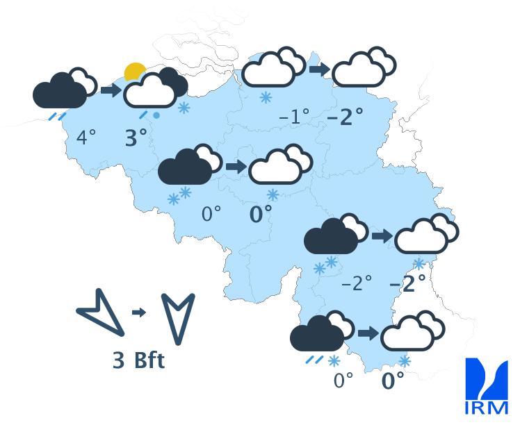 Ce samedi, le ciel sera nuageux avec encore des chutes de neige (sur l'ouest, d'abord de la neige fondante) dont l'intensité diminuera à partir du nord. L'après-midi, le temps deviendra généralement sec dans la plupart des régions. Les températures baisseront durant la matinée avec des températures vers midi entre -5 degrés en Hautes Fagnes, -2 ou -3 degrés sur le centre et +1 degrés à la côte. Dans l'intérieur du pays, le vent sera modéré de nord à nord-ouest. A la côte, le vent assez fort de nord s'orientera entre le nord et le nord-est.