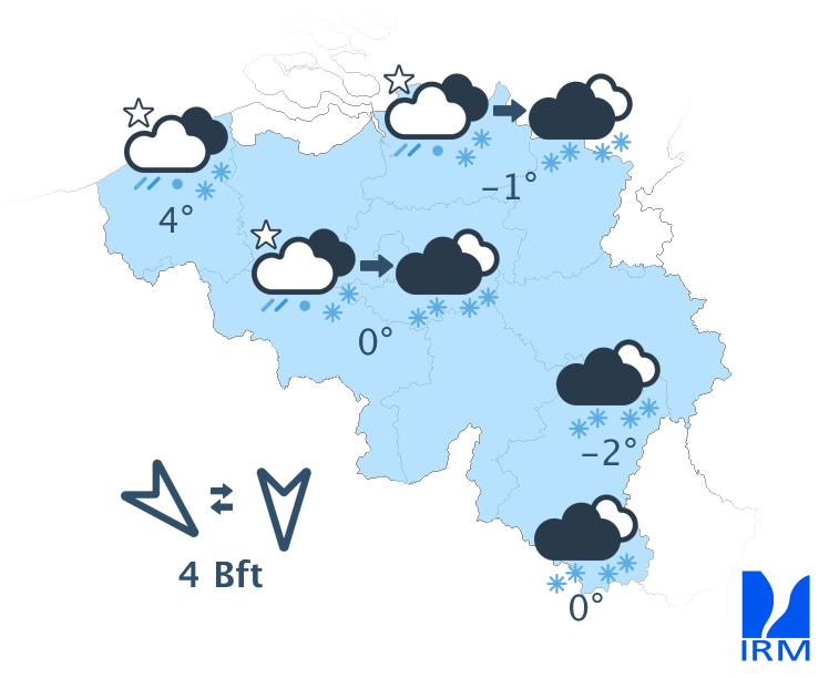 Cette nuit, le ciel restera très nuageux avec des chutes de neige au sud du sillon Sambre et Meuse. En Ardenne, ces chutes de neige seront abondantes. Ailleurs, les précipitations tomberont d'abord sous forme pluie ou de neige mouillée, se transformant à partir du nord-est en neige avec la possibilité d'une accumulation de 1 à 3 cm. Sur l'ouest, les températures resteront légèrement positives avec de la pluie ou de la neige fondante. Les minima samedi matin se situeront entre -4 degrés en Hautes Fagnes et +2 sur l'extrême ouest. Le vent dans l'intérieur du pays sera généralement modéré de secteur nord à nord-ouest. A la côte, le vent sera assez fort de nord.