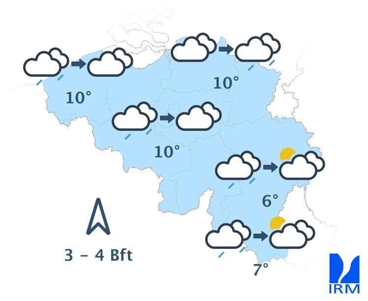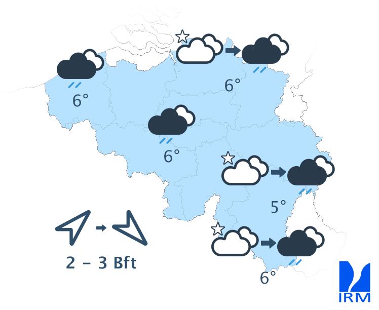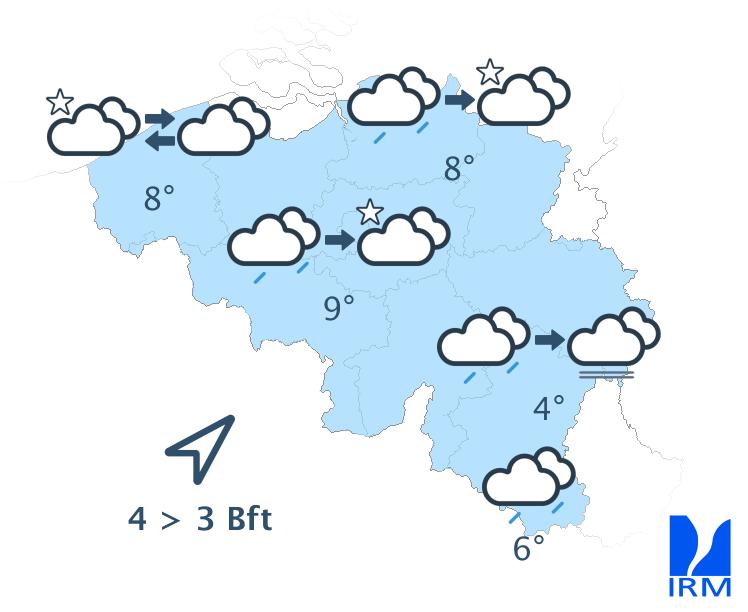 Demain matin, la pluie gagnera la partie est du territoire et des éclaircies apparaîtront à la mer et dans le nord. En début d'après-midi, quelques faibles précipitations pourront encore traîner, surtout en Ardenne. Au cours de l'après-midi, le risque d'averses augmentera à nouveau partout à partir du sud-ouest et les éclaircies disparaîtront dans le nord. Les températures maximales seront comprises entre 4 et 9 degrés. Le vent sera d'abord faible de nord ou de direction variable dans la moitié nord du pays, et modéré de secteur sud-ouest dans la moitié sud. Par la suite, il deviendra faible à modéré de sud à sud-est partout.