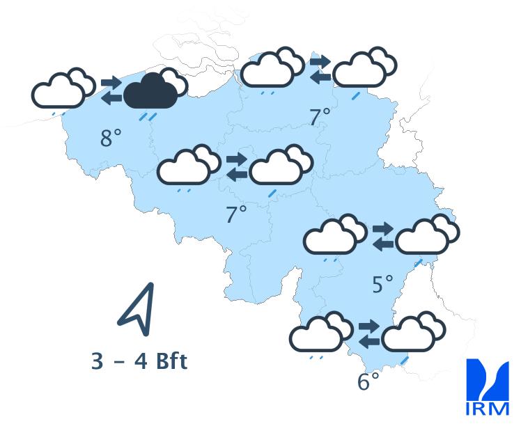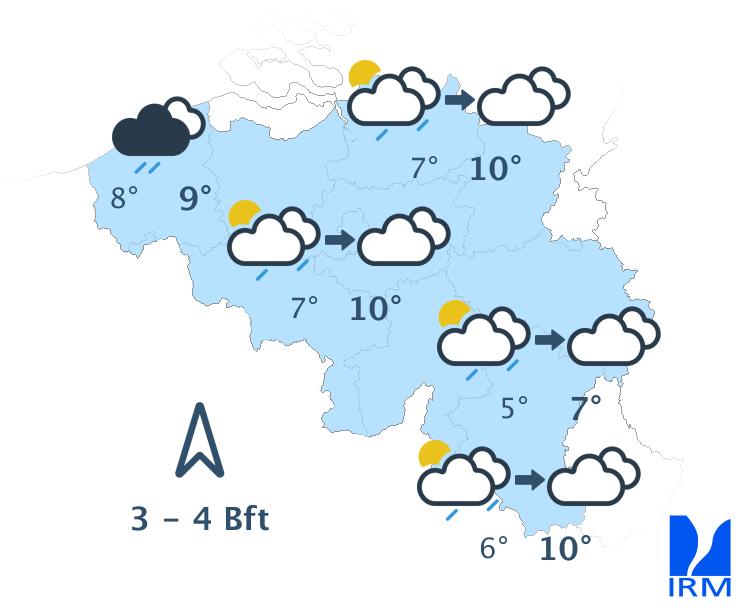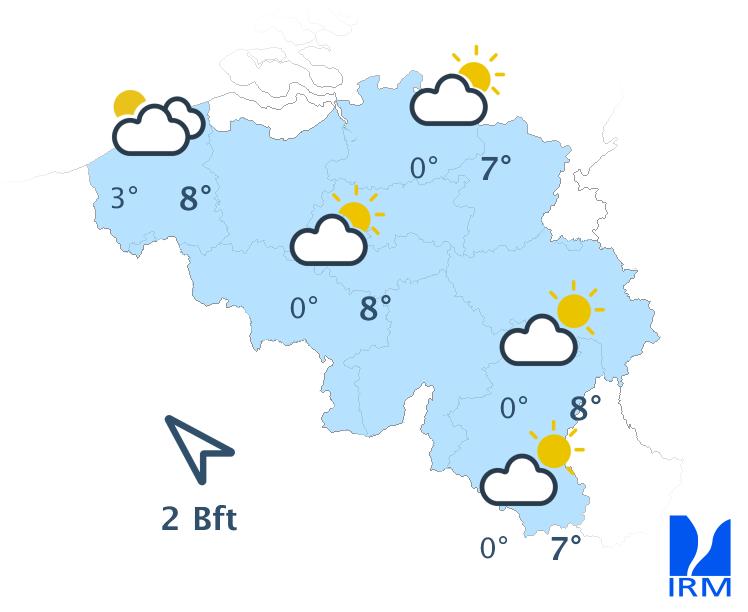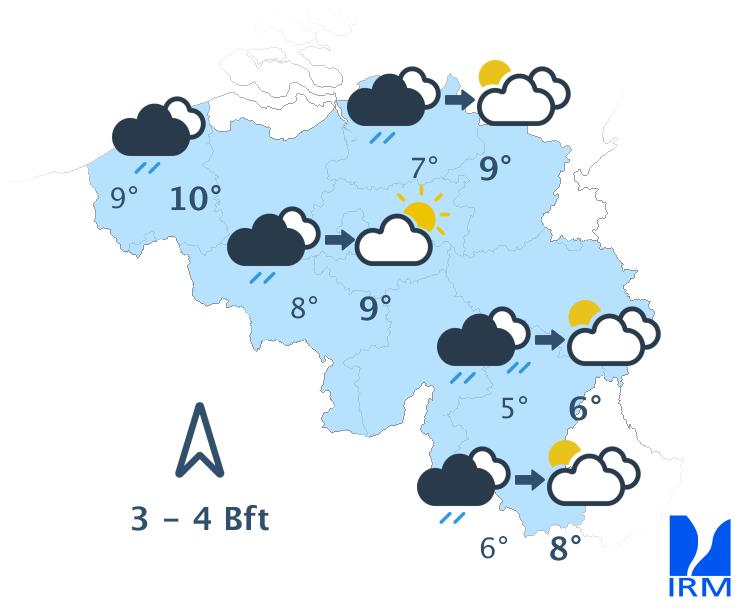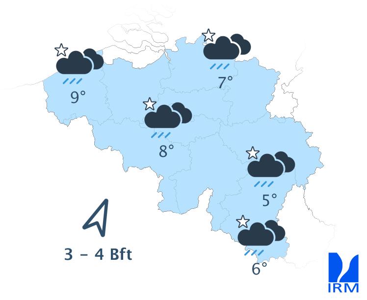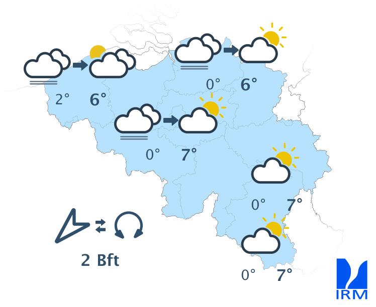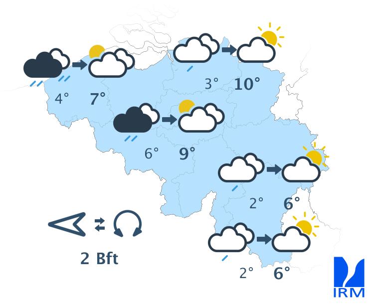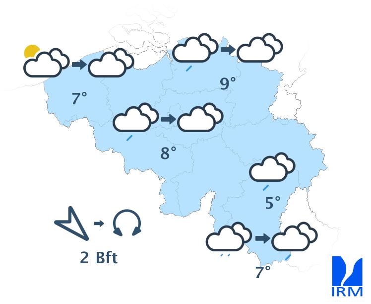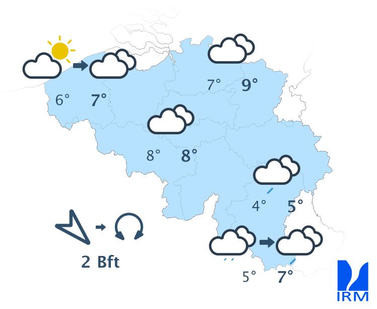 Mercredi, on attend de faibles pluies dans les régions situées au sud du sillon Sambre et Meuse, tandis que des éclaircies apparaîtront dans l’extrême nord-ouest du pays. Dans la plupart des régions, le ciel restera nuageux toute la journée et, en Ardenne, le temps pourrait même devenir brumeux. En fin d’après-midi, la nébulosité augmentera à nouveau dans l’extrême nord-ouest et un risque de quelques gouttes apparaîtra dans le sud-est. Les maxima varieront entre 4 à 5 degrés en Ardenne et 8 à 9 degrés en Flandre. Le vent soufflera faiblement de nord-ouest ou de direction variable sur la moitié nord-ouest du pays, et modérément de sud-ouest dans les régions situées au sud du sillon Sambre et Meuse. En fin d’après-midi, le vent deviendra partout faible de secteur sud à sud-est.