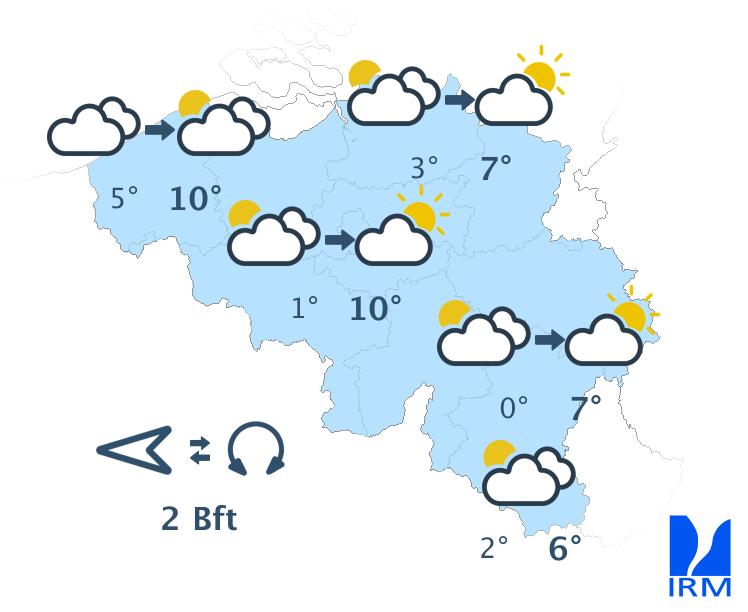 Vendredi matin, on peu s’attendre à de nombreux nuages bas sur la partie sud-est du pays avec quelques pluies. Ailleurs, le temps sera souvent sec avec des éclaircies. En cours de journée, la nébulosité deviendra variable partout avec un risque de faibles précipitations par endroits. Les maxima évolueront peu, oscillants entre 6 et 11 degrés. Le vent sera modéré de sud-sud-ouest, devenant faible à modéré dans l'après-midi et revenant au sud à sud-est.