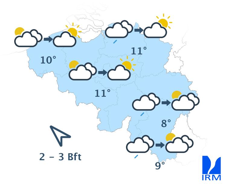 Aujourd'hui, la journée débutera sous un ciel assez nuageux avec encore quelques faibles pluies résiduelles. Le temps deviendra ensuite sec avec un ciel partiellement nuageux et essentiellement des bancs nuageux de moyenne et de haute altitude. Les nuages seront un peu plus insistants sur l'ouest du pays. Il fera doux avec des maxima de 7 degrés sur les hauteurs de l'Ardenne à 10 ou 11 degrés en Flandre et dans le centre du pays. Le vent sera faible à modéré de sud-est.