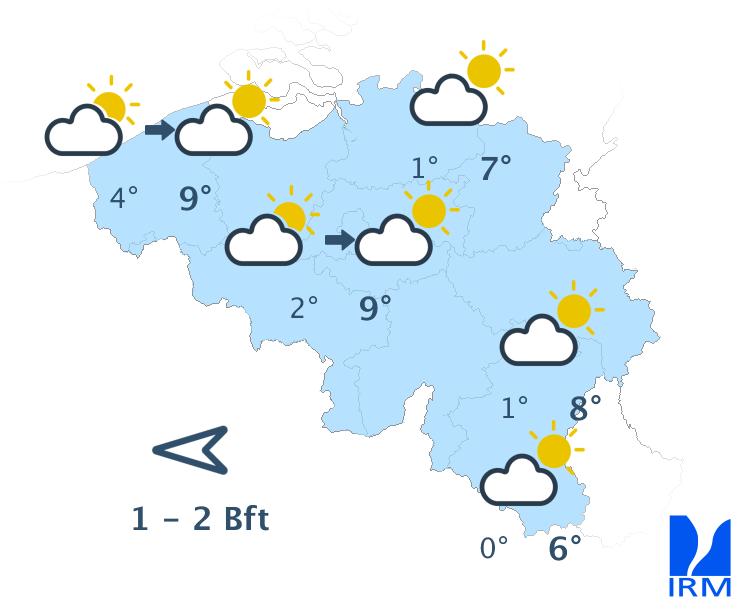 Lundi, le soleil sera à nouveau présent tout comme des champs nuageux. Le temps sera généralement sec et, après des gelées nocturnes en plusieurs endroits, les températures remonteront vers des valeurs de 4 à 8 degrés. Le vent sera faible et variable ou de secteur est à sud-est.
