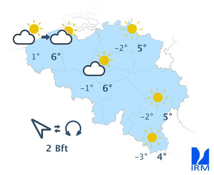 Mardi, la journée débutera avec des gelées en plusieurs endroits et localement aussi éventuellement un peu de grisaille matinale. Ensuite, le ciel sera le plus souvent ensoleillé. Les maxima varieront entre 5 et 10 degrés, sous un vent faible d'est ou sans direction privilégiée.
