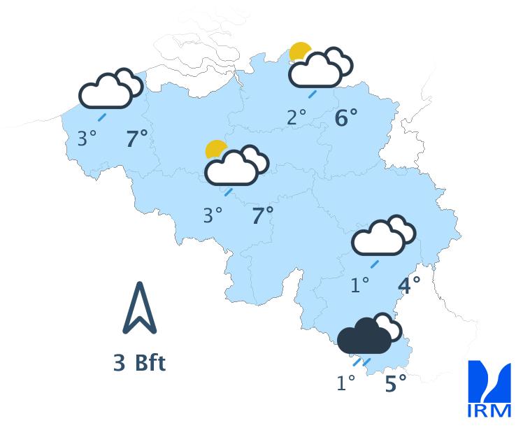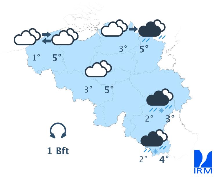 Jeudi, le ciel sera à nouveau très nuageux. Sur le nord, le nord-est et l'est du pays, nous prévoyons parfois quelques pluies ou de la neige fondante; sur les hauteurs, il s'agira d'un peu de neige fondante ou de neige. Ailleurs, le temps restera généralement sec. Les maxima se situeront entre environ 0°C en Hautes-Fagnes et 6°C sur l'extrême ouest et sud-ouest du territoire, sous un vent globalement faible de direction variable ou de secteur nord-ouest.