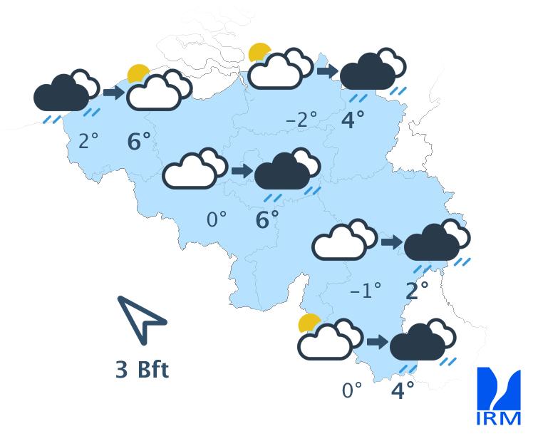 Mardi matin, le ciel sera très nuageux avec graduellement des pluies faibles à parfois modérées de l'ouest au centre. L'est du pays devrait garder en premier lieu un temps généralement sec avec quelques éclaircies. En début d'après-midi, la zone de pluie concernera l'entièreté du territoire avec possibilité de neige fondante en haute Ardenne. Plus tard dans l'après-midi, un temps sec avec quelques éclaircies reviendront sur l'ouest. Les maxima seront compris entre 1 degré sur les sommets de l'Ardenne et 6 degrés en plaine. Le vent modéré de sud-est, parfois assez fort à la côte, deviendra faible à modéré dans l'après-midi et virera au secteur sud.