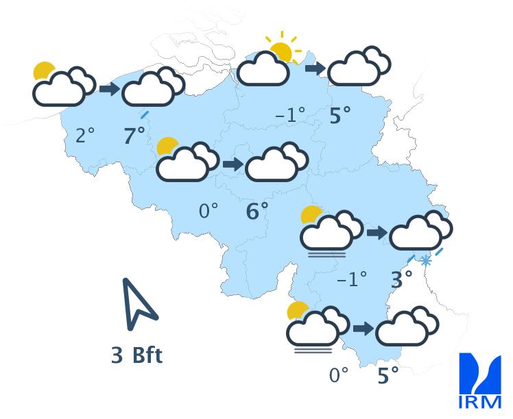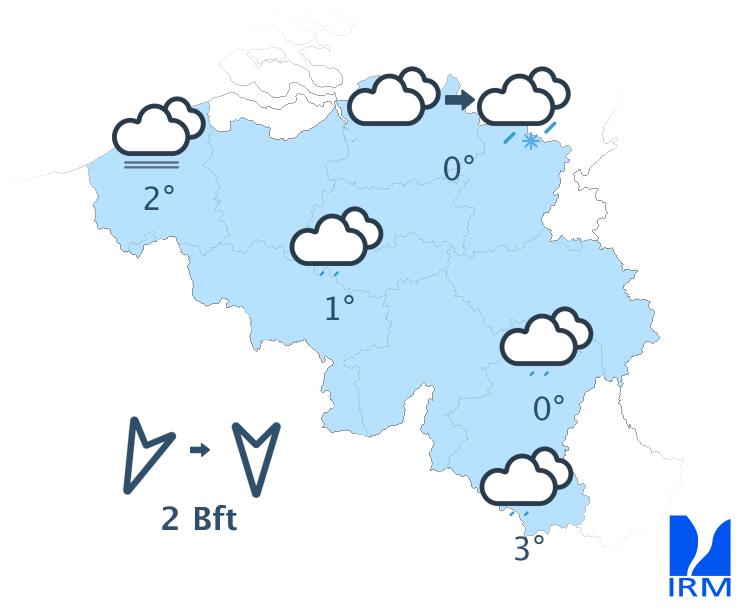 Cette nuit, quelques précipitations pourront être observées sur l'extrême est et nord-est du pays, d'abord sous forme de neige fondante puis de neige avec formation d'une petite accumulation. Ailleurs, le ciel restera couvert avec un risque de faibles bruines. Brumes et brouillards pourront se former par endroits. Les minima se situeront aux alentours de -1 ou 0 degré en Ardenne et dans le nord du pays, +1 degré dans le centre et +2 ou +3 degrés dans les régions proches de la France. Le vent sera généralement faible de nord à nord-est.