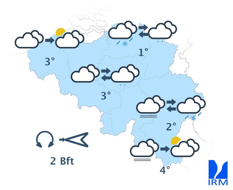 Aujourd'hui, le ciel restera le plus souvent gris avec une importante couverture de nuages bas et parfois un peu de bruine. Sur l'extrême est et nord-est du pays, quelques faibles chutes de neige ou de neige fondante pourront encore temporairement se produire. De la brume ou du brouillard pourra également limiter la visibilité ce matin. Les maxima varieront entre 0 degré dans le Cantons de l'Est, 2 ou 3 degrés dans les régions proches des Pays-Bas et 5 ou 6 degrés à proximité de la France. Le vent sera faible de direction variable.