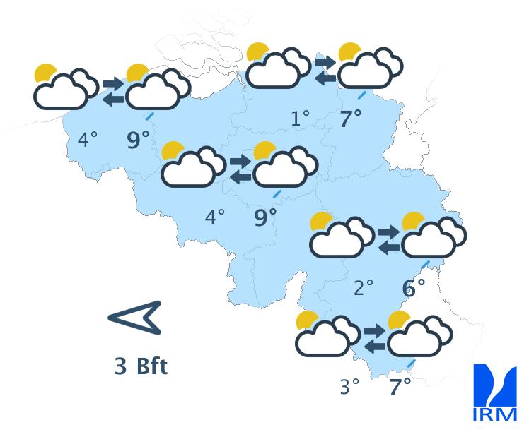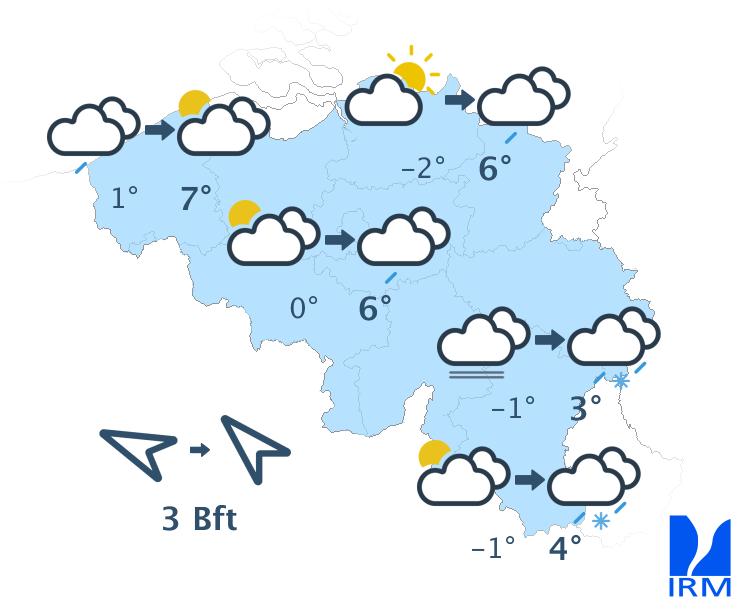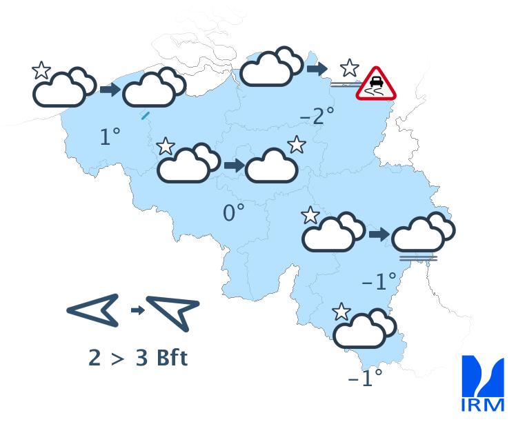 Ce soir, quelques timides éclaircies feront leur apparition. La nuit prochaine, les éclaircies s'élargiront temporairement, mais des bancs de nuages bas persisteront dans certaines régions, surtout sur l'ouest et le sud du pays. En fin de nuit, la nébulosité augmentera à nouveau dans les régions proches de la France, mais le temps devrait encore rester généralement sec. Du brouillard givrant pourra se former en Ardenne. Les minima varieront entre -3 et -1 degré en Ardenne et entre -1 et +2 degrés en Basse et Moyenne Belgique. Le vent faible d'est à sud-est deviendra graduellement modéré.
