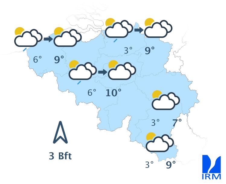 Demain, quelques éclaircies passagères seront encore possibles en début de journée (surtout sur la moitié nord-est du pays). La nébulosité augmentera ensuite à partir de la France avec graduellement quelques faibles pluies intermittentes, et en Ardenne quelques précipitations hivernales. Les maxima varieront entre 2 et 8 degrés avec un vent généralement modéré de sud à sud-est.
