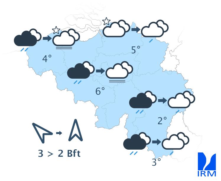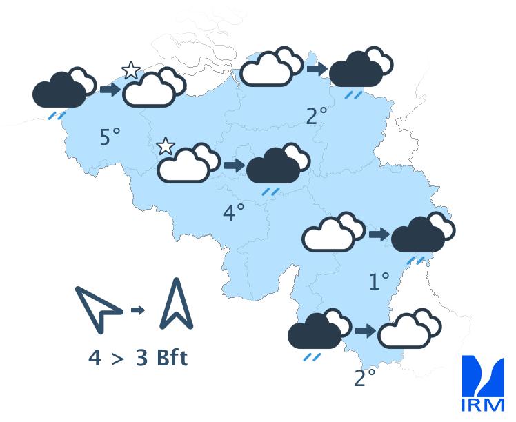Ce soir, une nouvelle zone de pluie atteindra notre pays par la frontière française. Durant la nuit, elle progressera lentement vers le nord-est. A l'aube, quelques éclaircies pourraient se développer sur l'ouest du territoire. Les minima seront compris entre 1 et 6 degrés, sous un vent d'abord modéré de secteur sud-est, virant ensuite au secteur sud et devenant faible à modéré.