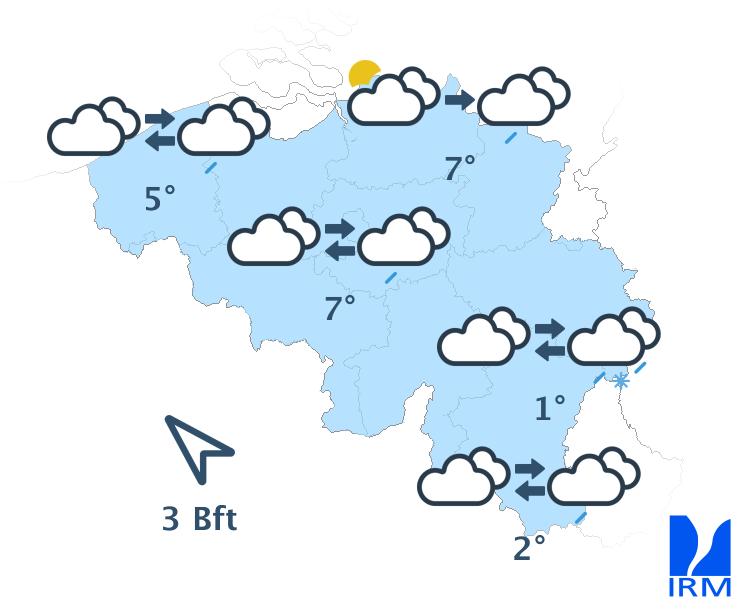 Dimanche matin, il fera très nuageux en Ardenne et en Lorraine belge avec un risque de brouillard. Ailleurs, la nébulosité sera temporairement plus variable. Le ciel s'ennuagera ensuite rapidement sur les autres régions et quelques averses (parfois sous forme de grésil) pourront à nouveau se produire localement. Les maxima se situeront entre 3 et 9 degrés sous un vent faible à régulièrement modéré de sud à sud-est.