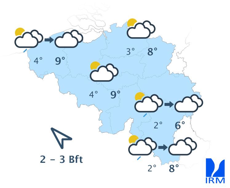 Samedi commencera avec quelques éclaircies dans l'ouest et beaucoup de nuages bas du centre à l'est du pays, avec un risque de brouillard en Ardenne. Quelques pluies seront également encore possibles sur l'est. Ensuite, le ciel deviendra partout partiellement à très nuageux avec la possibilité d'une averse. Les maxima oscilleront entre 5 et 10 degrés sous un vent faible à modéré de sud à sud-est.