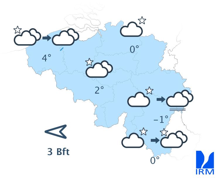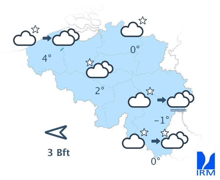 Ce soir, de larges éclaircies reviendront progressivement depuis le sud du pays. Ensuite, la nébulosité augmentera depuis la France avec la possibilité de quelques gouttes le long de la frontière française en fin de nuit. Les éclaircies persisteront davantage le long des frontières allemande et néerlandaise tandis que des nuages bas se reformeront sur le Massif ardennais. Les minima seront compris entre -1 degré en Ardenne, 0 à 1 degré en Campine, et 4 degrés sur l'ouest. Le vent restera généralement modéré de secteur est à sud-est.