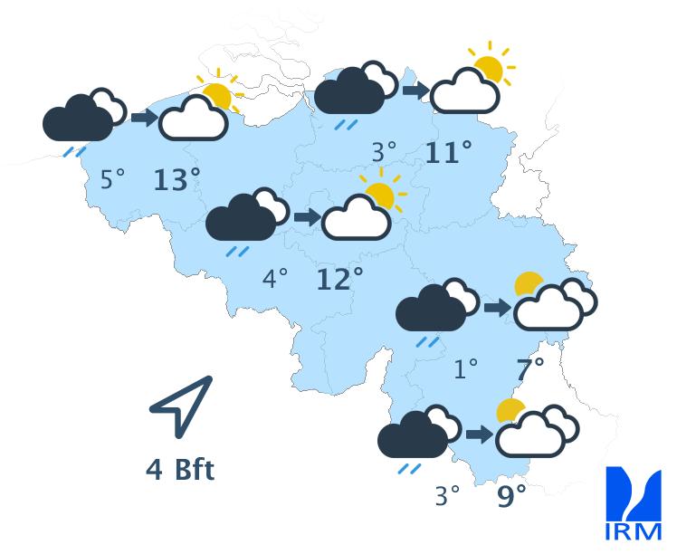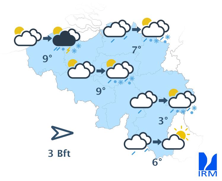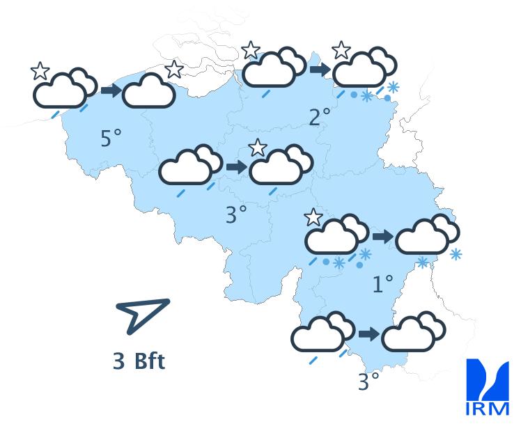 Demain matin, la nébulosité deviendra rapidement variable avec des averses qui adopteront parfois un caractère hivernal (pluie, neige fondante ou grésil). Sur les hauteurs de l'Ardenne, un peu de neige pourra même s'accumuler. Sur l'ouest, ces averses devraient être moins fréquentes. Les maxima varieront entre 0 degré sur les Cantons de l'Est et 5 ou 6 degrés en plaine. Le vent sera modéré de secteur ouest virant à l'ouest-nord-ouest. A la côte, il sera modéré de nord-ouest avec des rafales jusque 60 km/h.