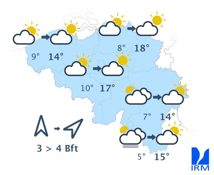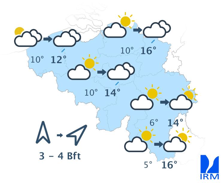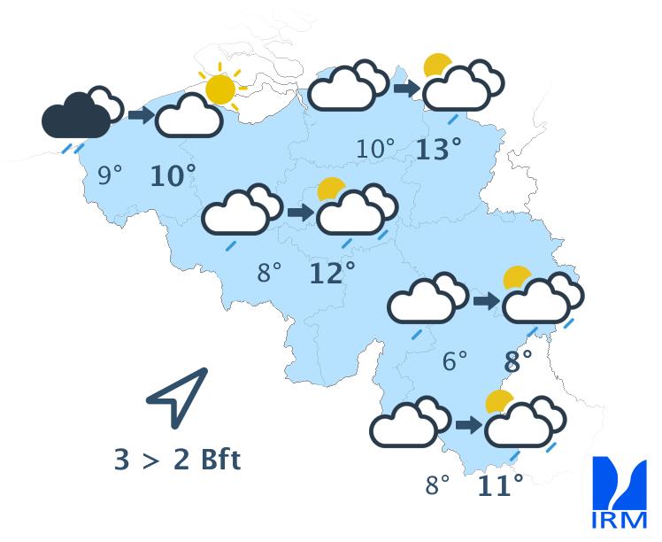Vendredi, il y aura d'abord du soleil, excepté sur l'ouest et le nord-ouest du pays. Au fil des heures, les champs nuageux se répandront vers le centre alors qu'une zone de pluie atteindra le pays depuis le littoral. Au sud du sillon Sambre-et-Meuse, le temps restera sec avec de larges éclaircies voire même un temps ensoleillé jusqu'en fin de journée sur l'est et le sud-est. Les maxima seront voisins de 11 à 12 degrés à la mer, 13 ou 14 degrés en Ardenne et 16 degrés en Campine ou en Lorraine belge. Le vent modéré de sud s'orientera au sud-ouest. A la mer, il sera parfois assez fort. Quelques rafales de 50 km/h seront également possibles.