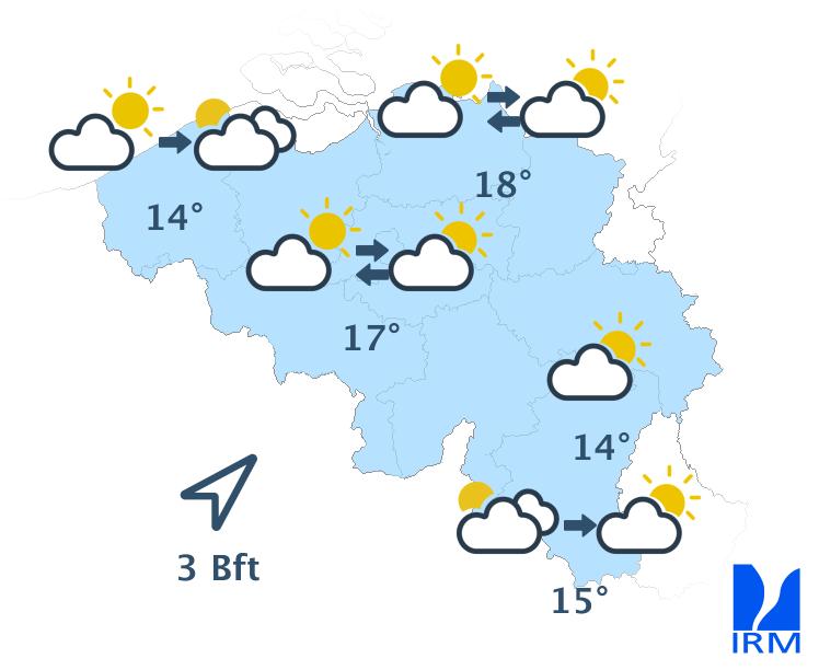 Ce soir, le temps sera souvent peu nuageux avec des nuages élevés. En fin de nuit, il y aura davantage de nuages sur l'ouest et le nord-ouest. Des nuages bas pourront également se former sur le flanc sud de l'Ardenne et en Lorraine belge. Les minima seront compris entre 5 ou 6 degrés en Haute Belgique et 9 à 11 degrés en Basse et en Moyenne Belgique. Le vent modéré de sud-ouest s'orientera au secteur sud.
