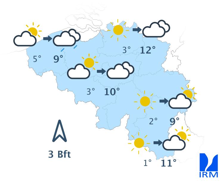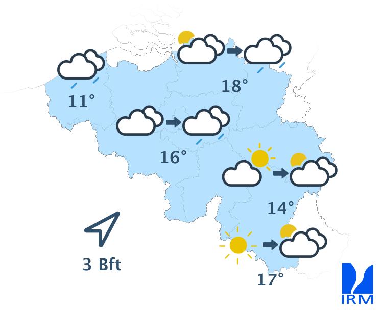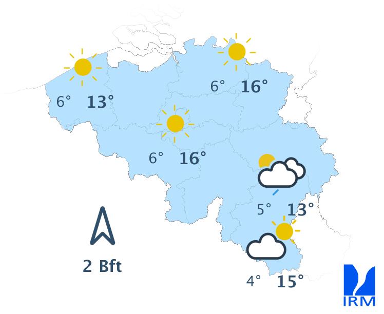 Cette après-midi, une perturbation traversera lentement notre pays depuis le littoral. Le temps sera déjà très nuageux sur la moitié ouest avec une zone de pluie qui progressera lentement de l’ouest de la Flandre vers la partie centrale du pays. Sur la moitié est, le temps sera encore temporairement très ensoleillé, mais au fil des heures, les champs nuageux gagneront également le sud du sillon Sambre-et-Meuse et n’atteindront l’extrême est qu’en toute fin de journée. Les maxima varieront entre 11 degrés au littoral, 16 degrés sur le centre et 18 degrés en Campine. Le vent sera modéré de secteur sud-sud-ouest.