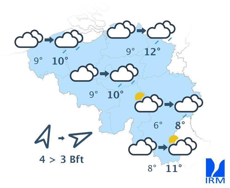Ce soir et en première partie de nuit, la zone de pluie ondulera temporairement sur le pays et gagnera finalement toutes les régions, à l’exception de l’extrême sud-est qui pourrait conserver des conditions sèches. En milieu de nuit, elle quittera définitivement notre territoire par le nord-est. Le ciel restera toutefois très nuageux avec la possibilité de quelques éclaircies, mais aussi de quelques ondées localisées. Les minima seront compris entre 5 degrés en Hautes-Fagnes et 8 à 9 degrés en plaine. Le vent restera modéré de sud-sud-ouest.