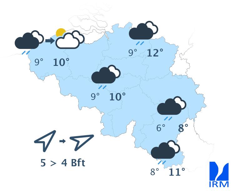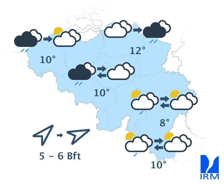 Aujourd'hui, le ciel sera généralement très nuageux avec, d'abord un peu de pluie ou une ondée par endroits. Dans le courant de la journée, davantage de pluies et d'averses suivront par l'ouest. En fin de journée, des éclaircies feront leur apparition sur l'ouest et le sud-ouest du pays. Les maxima s’échelonneront entre 7 degrés en Hautes-Fagnes et localement 12 degrés en Campine. Le vent de sud-ouest deviendra assez fort, parfois même fort à la mer, avec des rafales de 60 à 75 km/h.