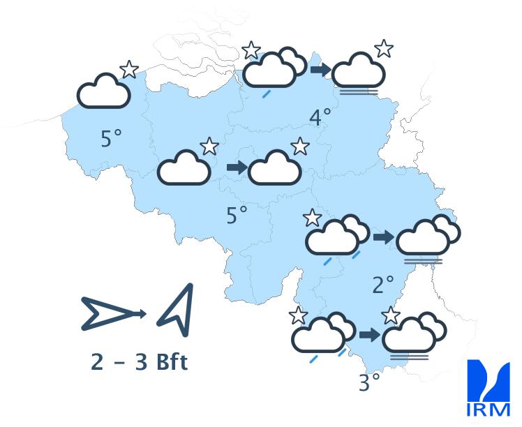 Ce soir, les dernières averses se décaleront vers l'est et de larges éclaircies se développeront à partir de l'ouest. Durant la nuit, le ciel se dégagera partout mais, vers l'aube, des nuages bas ou du brouillard se formeront sur le versant sud du relief de l'Ardenne ainsi qu'en Lorraine belge. Les minima seront de l'ordre de 0°C sur les hauteurs de l'Ardenne, de 4°C dans le centre et de 5 ou 6°C au littoral, sous un vent faible à modéré, d'abord de secteur ouest, revenant ensuite au secteur sud-ouest.