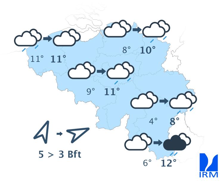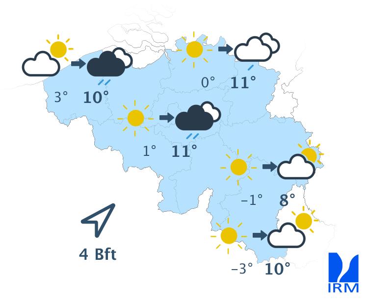 Cet après-midi, le ciel sera d'abord encore très nuageux sur la plupart des régions avec des pluies du centre à l'est du pays. Dans la région côtière, le temps sera déjà sec avec des éclaircies. Le ciel deviendra progressivement aussi plus changeant dans l'intérieur des terres avec toutefois risque de quelques averses (intenses). Les maxima se situeront entre 7 et 10°C en Haute Belgique et entre 10 et 13°C en Basse et Moyenne Belgique. Le vent, d'abord modéré à assez fort de secteur sud-sud-ouest, virera ensuite au secteur ouest et deviendra modéré. Au passage de la zone de pluie, des rafales jusqu'à 50 ou localement 60 km/h seront encore possibles.