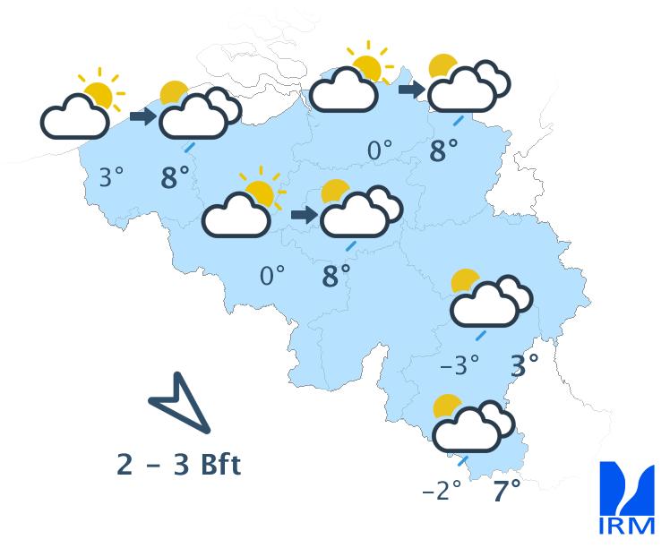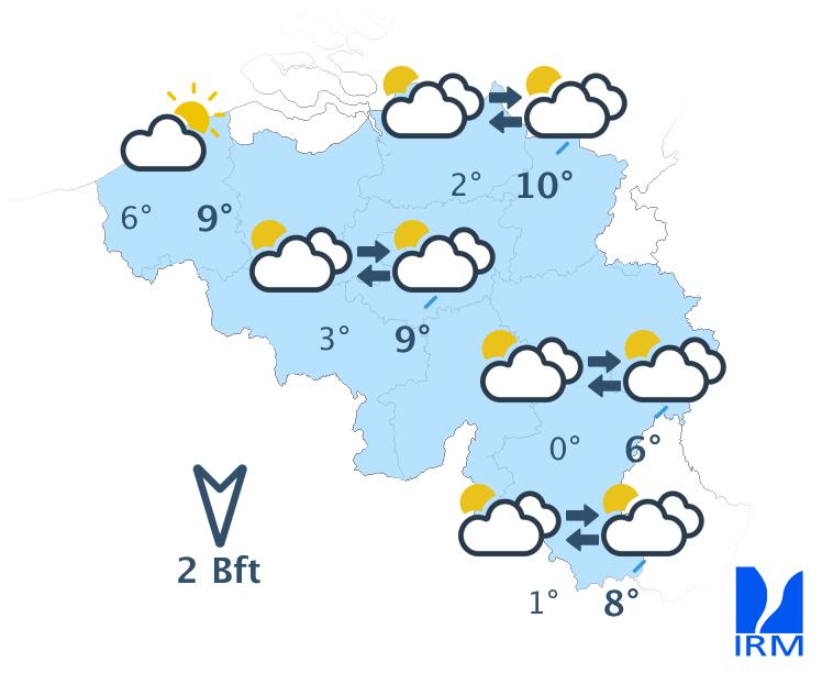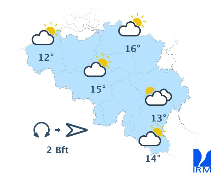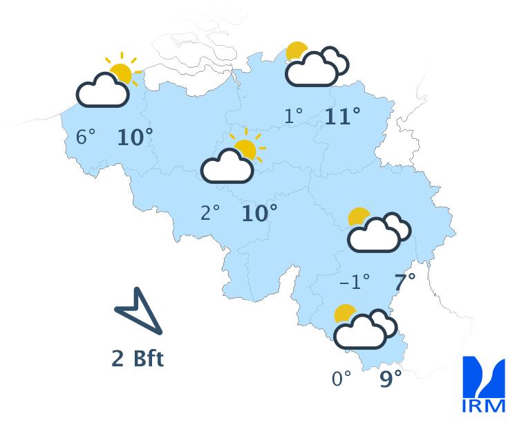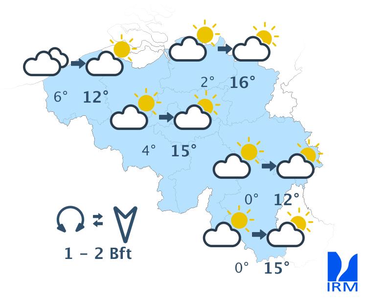 Ce soir, nous prévoyons de larges éclaircies avec des nuages d'altitude, surtout sur l'ouest du territoire. Durant la nuit, les ouvertures seront d'abord encore larges sur la partie sud-est du pays mais, ensuite, les nuages de haute et moyenne altitude deviendront assez nombreux à partir de l'ouest et du nord-ouest. Des bancs de brouillard pourraient localement se former en Haute Belgique. Les minima seront compris entre 1 et 4°C en Ardenne, et entre 4 et 7°C ailleurs. Le vent sera d'abord faible de direction variable, puis parfois modéré de secteur sud à sud-ouest (mais il restera faible et variable sur le sud-est du territoire).