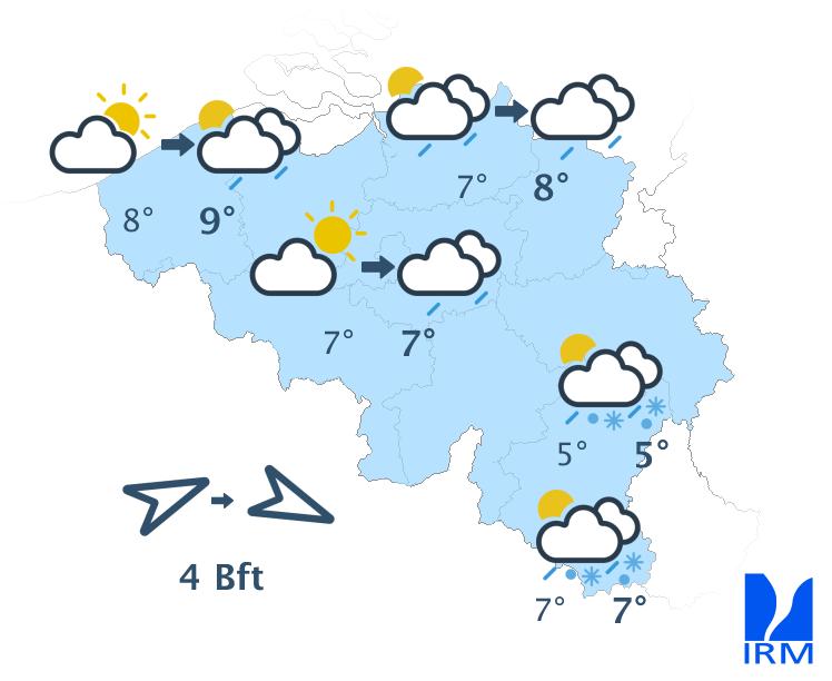 Vendredi, le ciel sera changeant avec souvent des périodes de temps sec mais aussi encore quelques averses locales; celles-ci seront toutefois moins fréquentes et intenses que les jours précédents. En soirée, une zone de pluie atteindra l'ouest de notre pays. Les maxima seront compris entre 3 et 9°C, sous un vent faible à modéré d'ouest à nord-ouest.