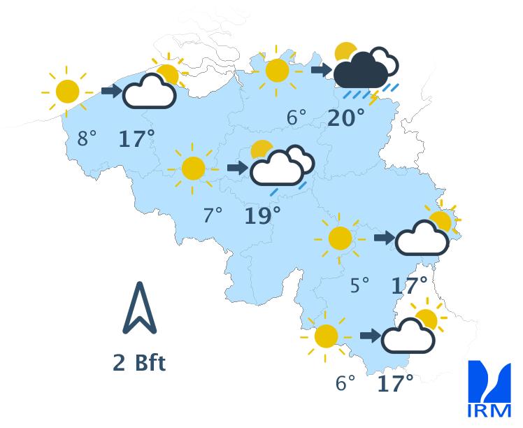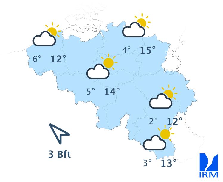 Demain, le temps sera sec avec des périodes ensoleillées, et des passages nuageux sous forme de bancs nuageux de moyenne et de haute altitude, et de cumulus qui se formeront dans l'intérieur du pays. Quelques bancs de brouillard seront également possibles en début de journée. Les maxima varieront entre 10 degrés dans les Hautes Fagnes et 14 ou 15 degrés dans le centre du pays. Le vent sera faible de sud-ouest s'orientant ensuite à l'est, ou parfois de direction variable. Une brise de mer de nord-nord-est se lèvera l'après-midi dans la région côtière.