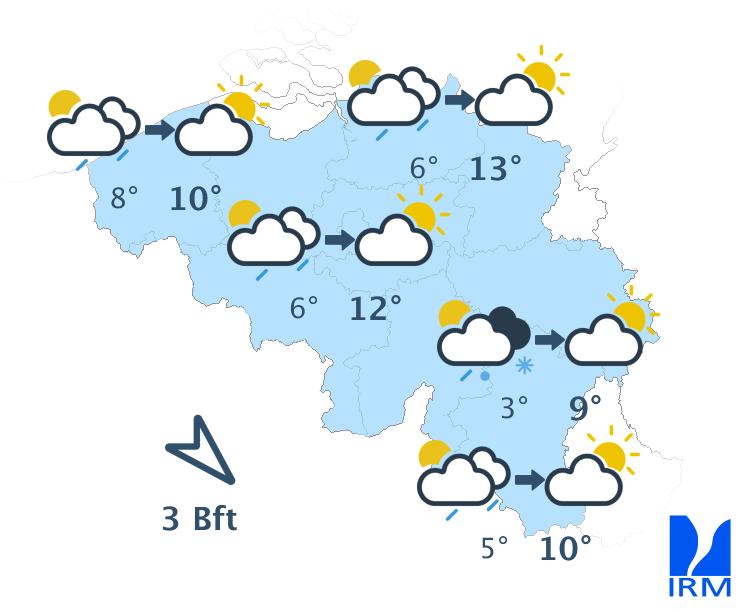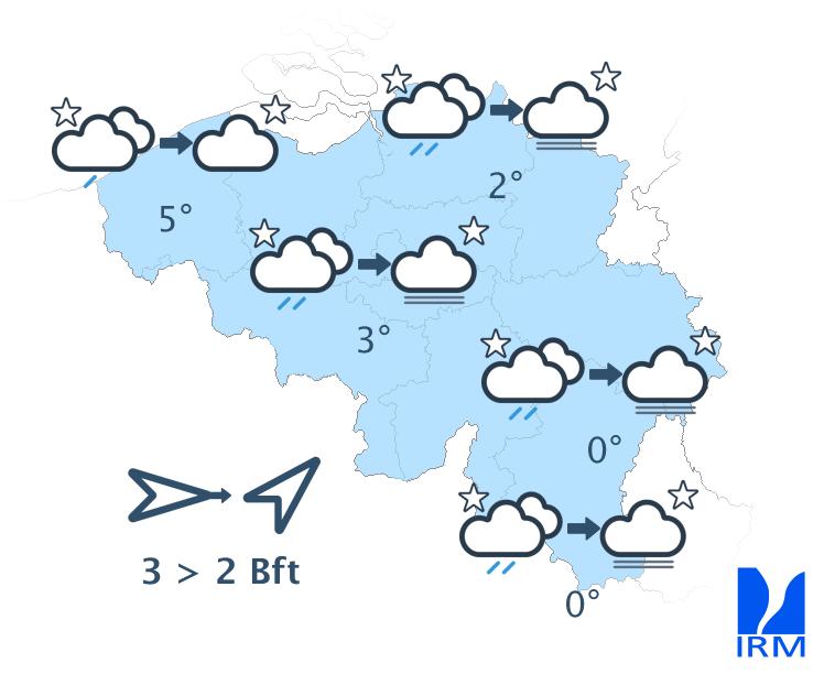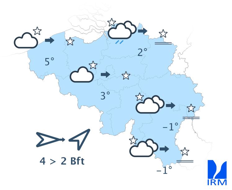 Quelques averses résiduelles pourront encore se produire ce soir. En fin de soirée et cette nuit, le temps redeviendra plus calme. Le ciel se dégagera dans la plupart des régions, ce qui favorisera un refroidissement assez marqué. Les minima varieront entre -3 et +2 degrés en Ardenne et entre 0 et 5 degrés dans les autres régions. De faibles gelées au sol seront probables et du brouillard pourra se former par endroits. Le vent deviendra faible de sud-ouest ou de direction variable. Le long du littoral, le vent restera modéré d'ouest à nord-ouest durant une grande partie de la nuit. En fin de nuit, il s'orientera au sud-sud-ouest.