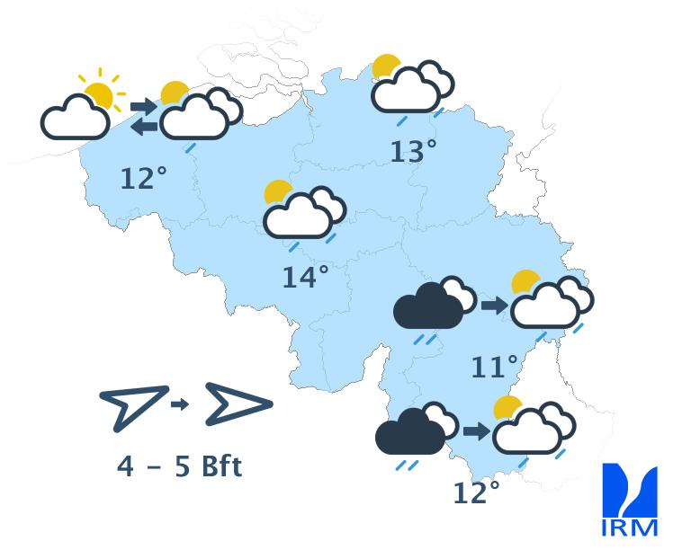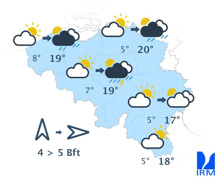 Jeudi commencera avec du soleil et des nuages d'altitude. En cours d'après-midi, des pluies et des averses sont prévues avec un risque d'orage. L'intensité des précipitations reste encore incertaine. Les maxima s'échelonneront de 15 à 20 degrés. Le vent faible à modéré de sud tournera vers l'ouest à nord-ouest et se renforcera pour devenir modéré à assez fort. Les rafales pourront dépasser 60 km/h dans l'intérieur et 70 km/h à la mer. Le risque de précipitations se maintiendra en soirée et la nuit suivante, avec la possibilité de giboulées.