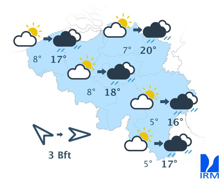 Jeudi commencera avec du soleil et quelques nuages d'altitude. L'après-midi, des nuages cumuliformes pourront se former dans l'intérieur des terres à partir de l'ouest. Plus tard, le développement localisé d'une averse n'est pas exclu. Les maxima, encore élevés pour la saison, se situeront entre 16 ou 17 degrés en bord de mer et par endroits 25 degrés dans l'intérieur. Le vent faible de sud deviendra faible à modéré, à la côte modéré à assez fort, d'ouest à sud-ouest.