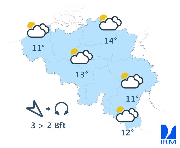 Demain, la journée débutera par des éclaircies et des champs nuageux d'altitude. Ces éclaircies pourront même temporairement être assez larges en matinée. En cours de journée, la nébulosité augmentera à partir de l'ouest et de la France, puis une perturbation accompagnée de pluie ou d'averses atteindra l'ouest du pays en milieu de journée. Elle s'étendra ensuite au reste du pays en cours d'après-midi. Quelques coups de tonnerre ne sont pas exclus. Il fera à nouveau beaucoup plus doux avec des températures maximales de 15 degrés le long du littoral, 19 ou 20 degrés dans le centre du pays à 21 ou même localement 22 degrés en Campine. Le vent modéré de sud-est s'orientera au sud-ouest, puis à l'ouest au cours de la journée. Il deviendra assez fort le long du littoral. Pendant les averses, des rafales pouvant atteindre 60 km/h, voire légèrement supérieures, seront possibles.