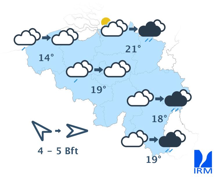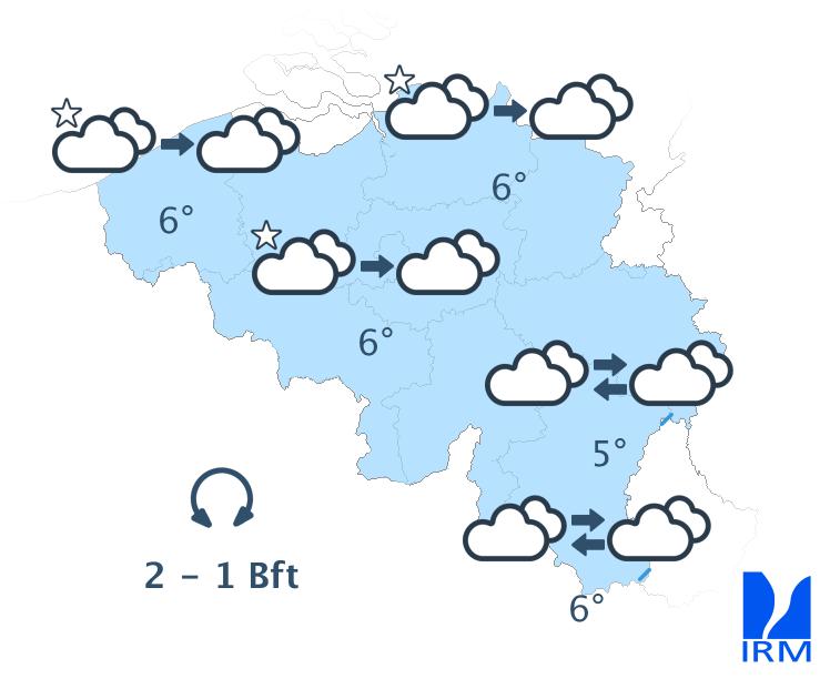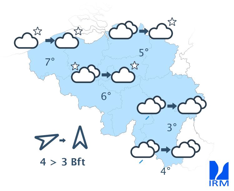 En début de nuit, de larges éclaircies se développeront sur l'ouest mais, sur l'est, le ciel sera encore très nuageux avec encore un risque de pluie. Plus tard dans la nuit, le temps deviendra sec partout avec un ciel voilé par quelques nuages d'altitude passagers, sauf dans le sud-est où la nébulosité restera assez abondante. Les minima varieront de 2 à 7 degrés. Le vent modéré généralement d'ouest à sud-ouest reviendra au secteur sud et deviendra faible au sud du sillon Sambre et Meuse.