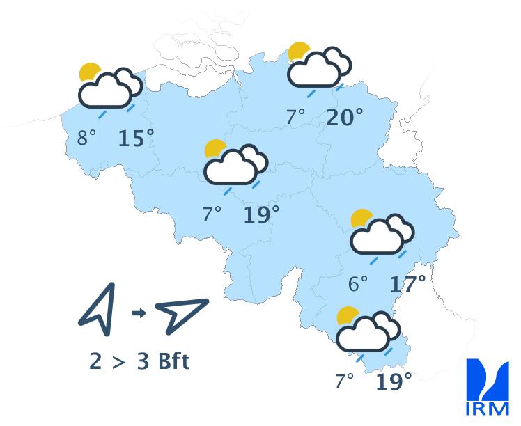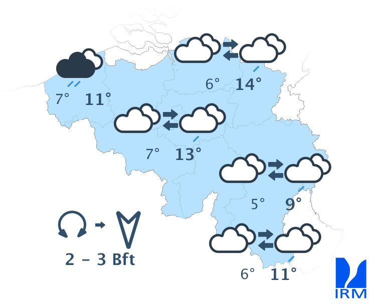 Mardi matin, un risque de nuages bas ou de brouillard sera à craindre. En journée, éclaircies et nuages alterneront. Une averse locale sera possible mais sur la plupart des régions le temps restera sec. Les maxima se situeront entre 11 degrés en Hautes-Fagnes ainsi qu'à la plage et 15 degrés dans le centre. Le vent sera le plus souvent faible et variable ou secteur ouest.