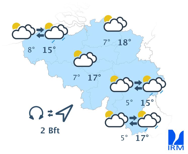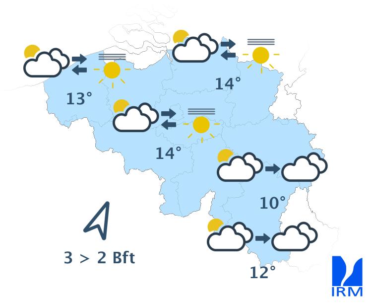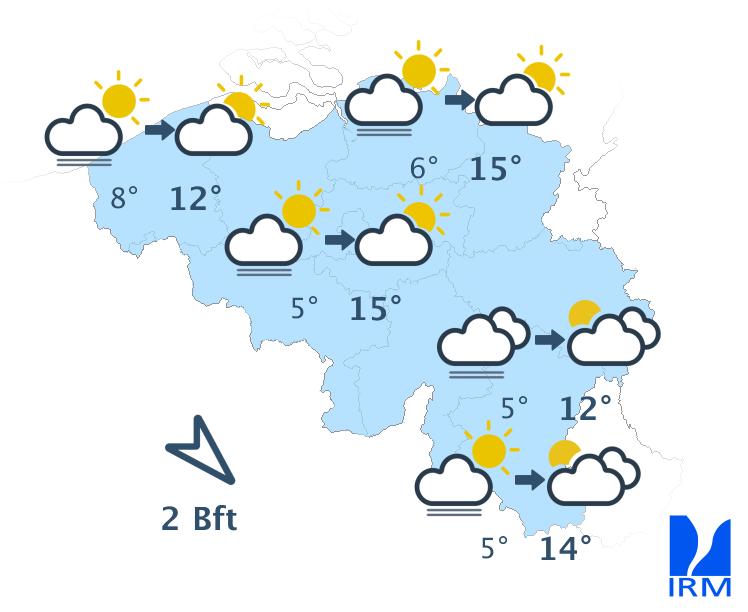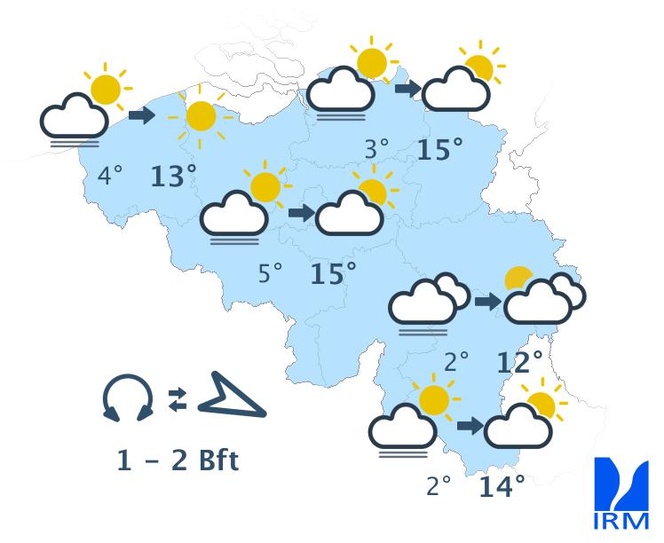 Mercredi, la journée débutera probablement avec du brouillard. Par après, éclaircies et nuages alterneront. Le temps devrait rester généralement sec. Les températures atteindront des valeurs de 12 degrés sur les hauteurs de l'Ardenne à 16 ou 17 degrés en Basse et Moyenne Belgique, sous un vent faible à modéré de sud.