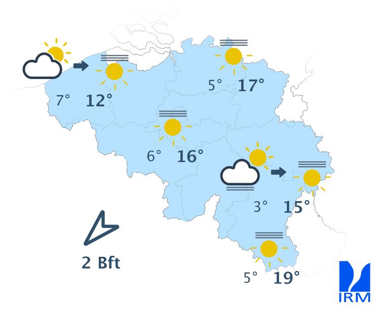 Vendredi, après une nouvelle nuit assez froide et la dissipation de la brume ou des bancs de brouillard présents par endroits à l'aube, le temps sera à nouveau ensoleillé avec des maxima de 14 à 17°C en Ardenne, de 17 à 19°C dans la plupart des autres régions de l'intérieur des terres, et de 12 à 15°C sur la bande côtière. Le vent sera faible à modéré de secteur nord à nord-est.