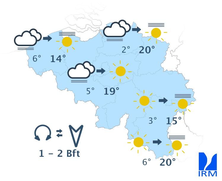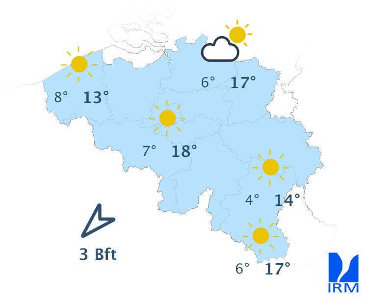 Après la dissipation de la grisaille locale, nous aurons du soleil et des nuages élevés. Les maxima se situeront entre 13 ou 14 degrés à la mer, 16 ou 17 degrés dans le centre et 18 degrés en Lorraine belge. Le vent sera faible à modéré de secteur nord-est.