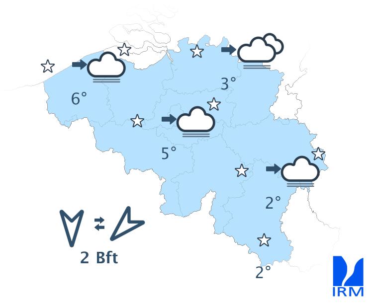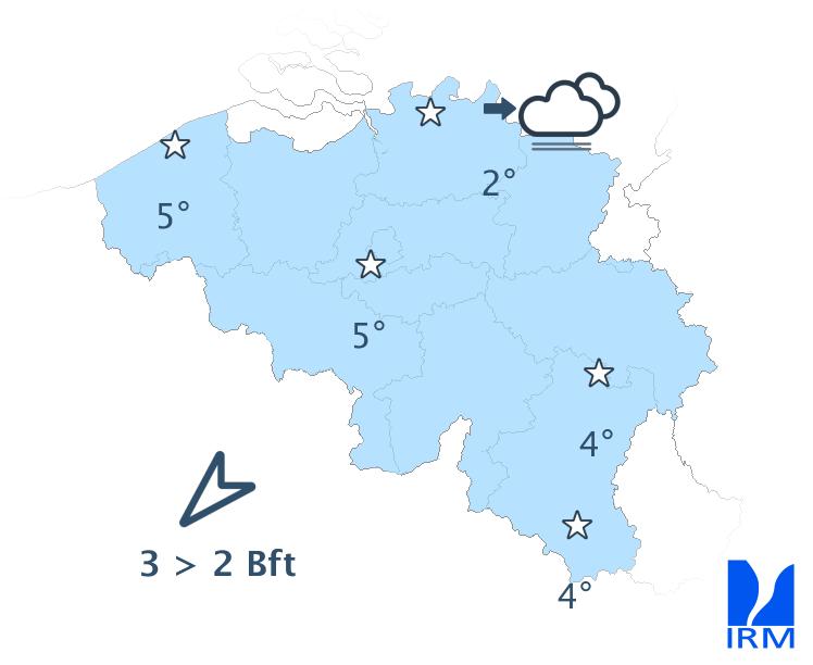 Cette nuit, le ciel restera complètement dégagé avec, à l'aube, possibilité de formation d'un peu de brume ou de quelques bancs de brouillard isolés sur l'est du territoire. Les minima se situeront généralement entre +1 et +4°C en dehors des villes, entre 0 et -3°C dans certaines vallées de l'Ardenne, et entre +4 et +7°C au cœur des grands centres urbains. Le vent d'est à nord-est deviendra faible, et parfois encore modéré à la côte ainsi qu'en Lorraine belge.