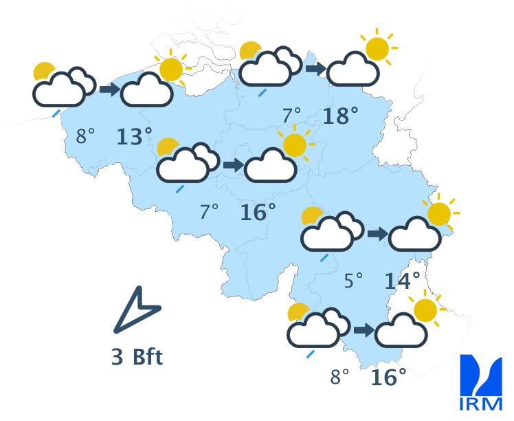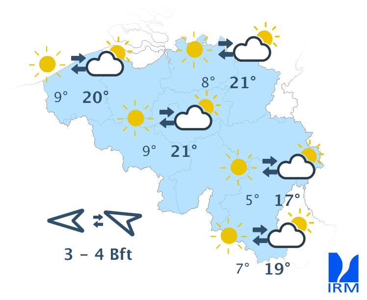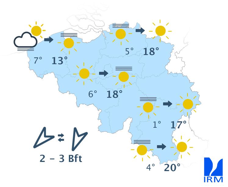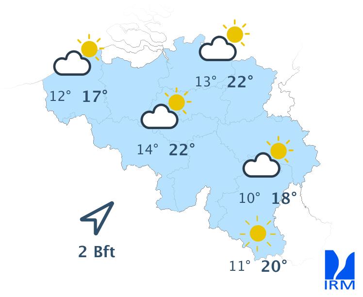 Après la dissipation des derniers bancs de nuages bas ou de brouillard pouvant encore être présents localement en mi-journée, nous profiterons d'une après-midi ensoleillée avec graduellement quelques nuages d'altitude à partir du sud-ouest. Les maxima se situeront entre 12 et 15°C dans la région côtière, entre 15 et 17°C sur les hauteurs de l'Ardenne, entre 17 et 19°C sur une large partie centrale du pays et atteindront jusqu'à 21°C en Lorraine belge. Le vent sera généralement faible et orienté au secteur nord; il deviendra parfois modéré sur le nord-ouest du territoire ainsi que le sud de l'Ardenne.