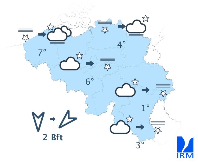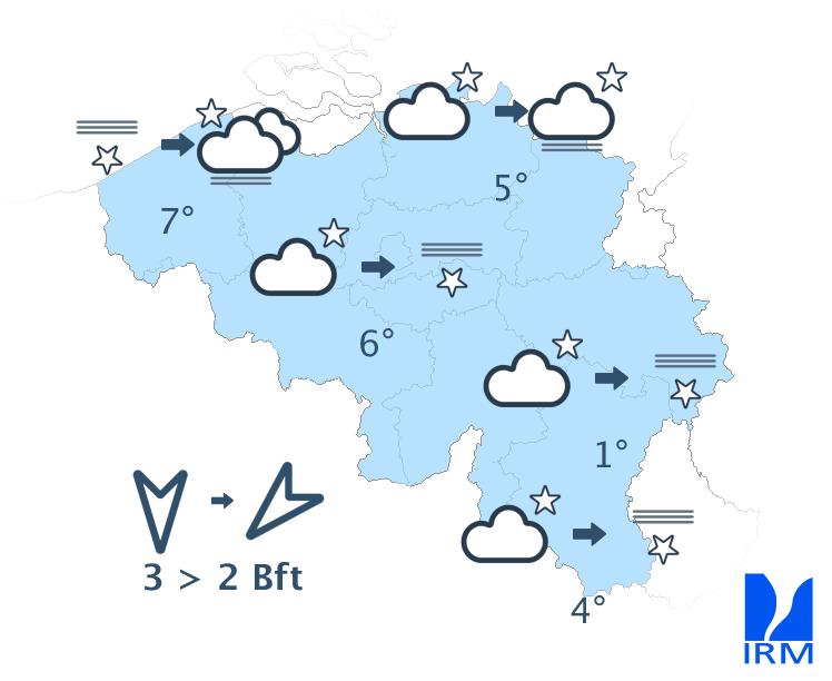 Ce soir et durant la nuit, des champs nuageux de haute et moyenne altitude en densité variable dériveront au-dessus de notre territoire. En seconde partie de nuit, des nuages bas ou quelques bancs de brouillard pourraient se former localement, et notamment sur l'ouest de la Flandre. Les minima seront compris entre -2 ou -3°C dans le fond de certaines vallées de l'Ardenne et +5 ou +6°C au cœur des grands centres urbains; à la côte, ils se situeront autour de +6 ou +7°C. Le vent, d'abord orienté au secteur nord, virera progressivement au secteur nord-est; il sera faible à parfois modéré dans les terres, et généralement modéré au littoral.