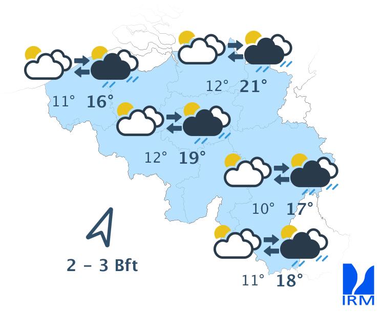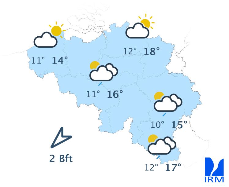 Mardi, la nébulosité sera variable avec la possibilité d'une ondée le long de la frontière française. Au fil de la journée, les éclaircies s'élargiront si bien que le ciel deviendra finalement ensoleillé sur toutes les régions. Les maxima oscilleront entre 14 à 15 degrés en Haute Ardenne ou à la mer, 20 à 21 degrés sur le centre et 22 degrés sur l'extrême sud du pays. Le vent de nord-est deviendra modéré dans les terres et assez fort à parfois fort au littoral. Au nord du sillon Sambre-et-Meuse, les rafales pourront atteindre 50 km/h.