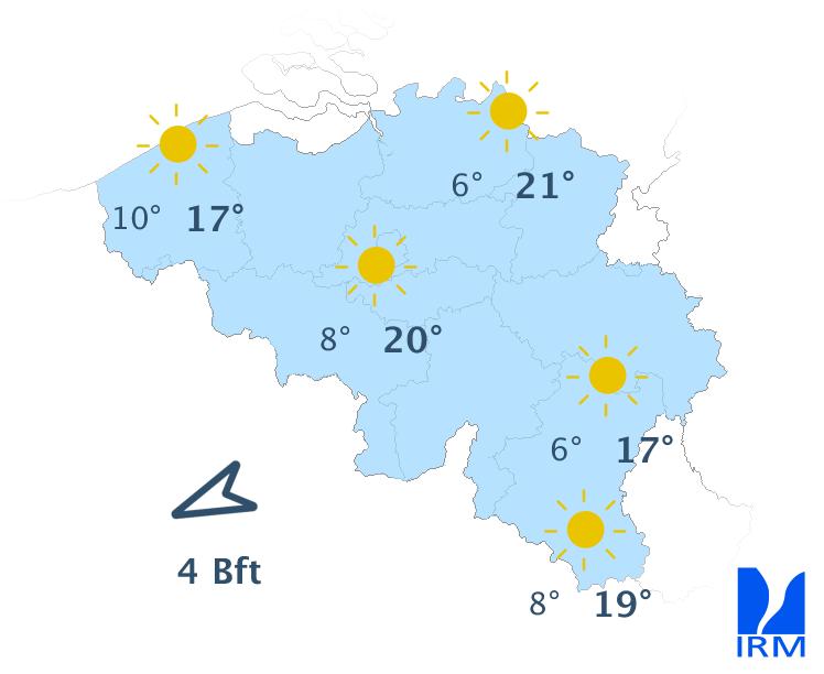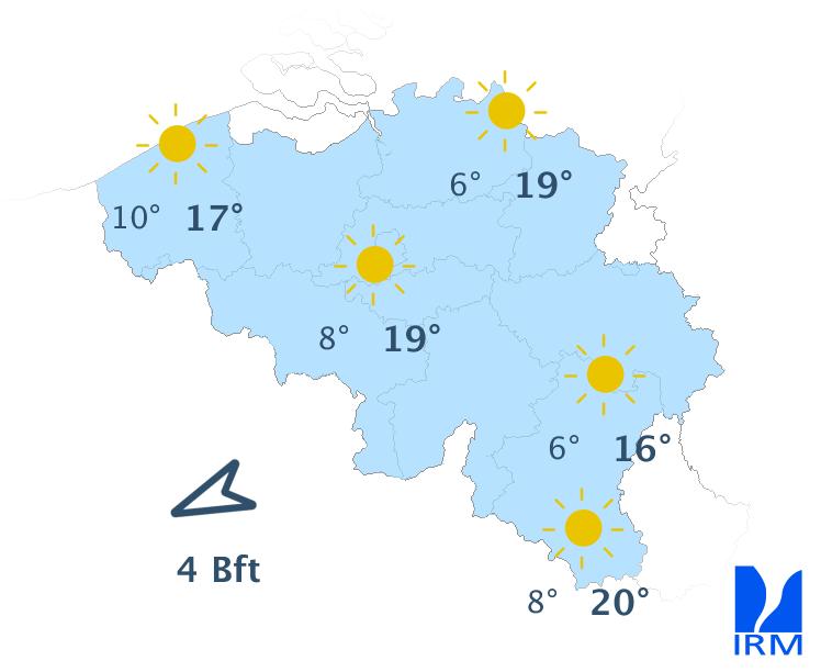 Mercredi, nous profiterons d'une belle journée ensoleillée avec des températures qui atteindront 15 degrés en Hautes-Fagnes et 20 degrés en plaine. Le vent sera modéré de secteur est-nord-est avec des rafales de 50 km/h.
