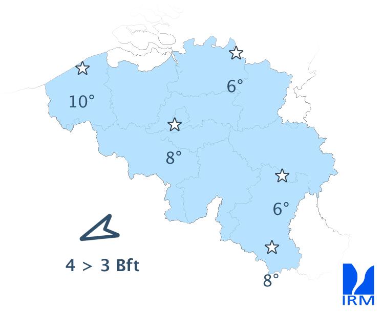 Mardi soir et la nuit suivante, le ciel restera serein sous des minima de 3 à 10 degrés. Le vent sera modéré de nord-est et à la mer, il deviendra parfois assez fort à localement fort tout en virant à l'est.