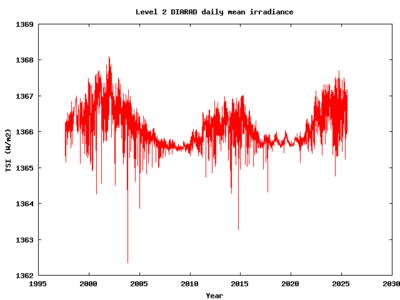 Ces variations sont importantes à surveiller : elles influencent la fréquence et l’intensité des tempêtes solaires, susceptibles d’affecter les satellites, les communications, les réseaux électriques et même l’atmosphère terrestre. Les cycles solaires apparaissent clairement dans les mesures de l’irradiance solaire totale (TSI) collectées par DIARAD.