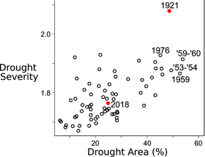 De sterkte (“Severity”) van de 1921-droogte en andere gekende Europese droogtes die plaats vonden na 1950, als functie van het percentage getroffen gebied (“Area”) binnen het ganse Europese domein dat werd bestudeerd. Elk bolletje stelt een specifiek droogtejaar voor.