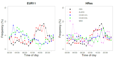 Frequentie van uurlijkse neerslagextremen als functie van het uur van de dag voor de modellen met lage ruimtelijke resolutie (links) en die met hoge resolutie (rechts). De waargenomen piek in de neerslagextremen doet (zwarte bolletjes) zich voor in de namiddag tussen 14u en 18u. De modellen met hogere resolutie ("HRes") reproduceren over het algemeen beter het dagelijkse verloop van de waarnemingen (“OBS”).