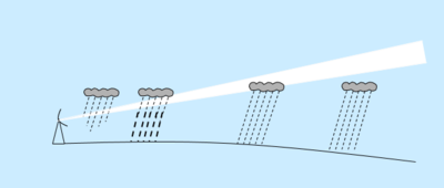 De weerradar is een vorm van telemeting, dus het op afstand meten van een parameter. Een radar meet de hoeveelheid teruggekaatste energie die uitgezonden werd, en eigenlijk zijn wij geïnteresseerd in de hoeveelheid neerslag aan de grond. De omzetting van gereflecteerde energie naar hoeveelheid neerslag is niet eenvoudig, en geeft aanleiding tot belangrijke fouten. Bovendien doet de radar metingen op een zekere hoogte boven de grond, zoals te zien op de figuur, en dit is afwijkend van een meting aan de grond.