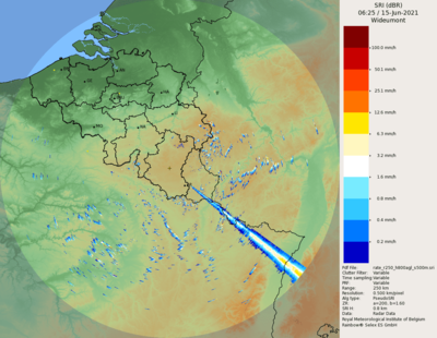 Het volgende beeld, genomen op 15 juni 2021 om 6u25 universele tijd, bevat grondecho's als gevolg van abnormale propagatie (het ruispatroon) en ook een duidelijke interferentie (de prominente lijnstructuur). Het radarbeeld toont dus een regenzone die er niet is. Door deze factoren is het correct interpreteren van radarbeelden een essentieel onderdeel bij het gebruik van deze beelden.